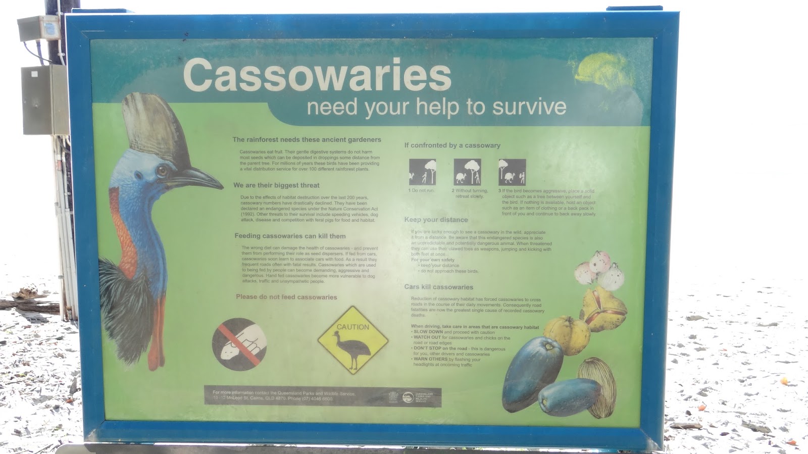 Le casoar est actuellement en voie de disparition. il reste moins de 1000 individus. Ces animaux peuvent se montrer très agressifs. Il se nourrit de fruits, sauf les agrumes, trouvés en fouraillant le sol.