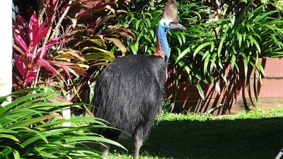 Le CASOAR est un oiseau coureur, incapable de voler. Il fait la taille d'un homme adulte, ses pattes sont grosses et puissantes, terminées par trois doigts ; le doigt intérieur porte une griffe aussi dangereuse qu'un poignard, une tête bleu et violet, des caroncules (excroissances charnues pendant a son cou) rouges, une corne semblable à un casque et un surprenant plumage noir qui s'apparente davantage à une tignasse.