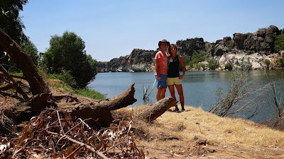 Geikie Gorge se trouve sur la route, et nous a permis de prendre un picnic aux abords de la rivière, où la tentation de la baignade est freinée par la présence de crocodiles. Nous y pendrons une douche solaire (douche portable où l'on remplie une poche d'eau).
