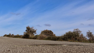 La route interminable presque déserte, quasi linéaire, conduit vers