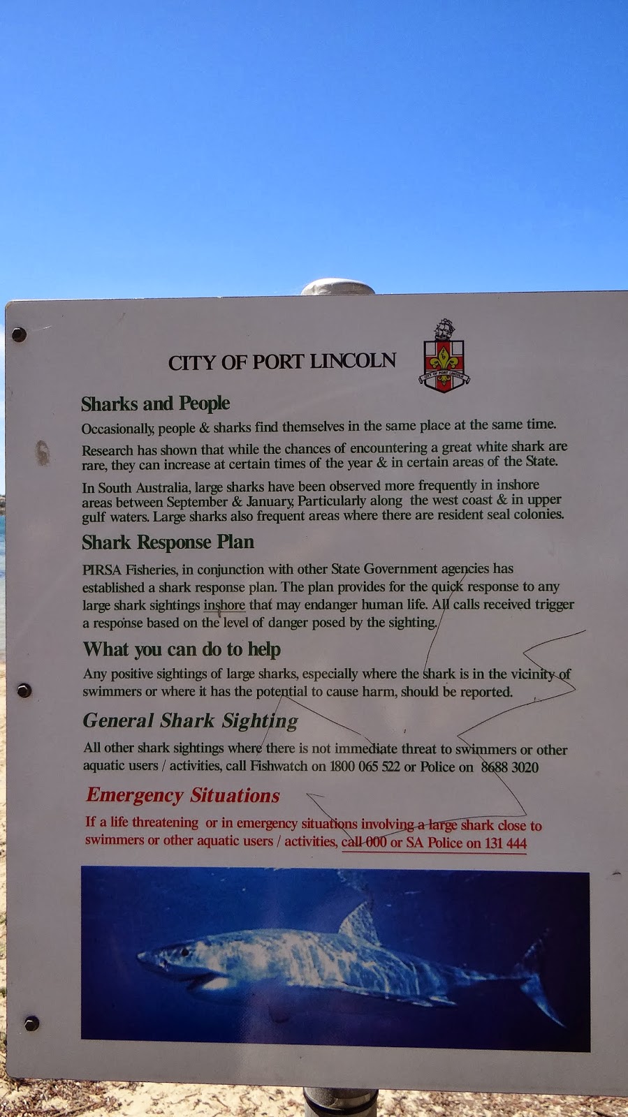 pour finir sur la pointe de la péninsule à Port Lincoln, où il est possible partir en mer afin d'entrer dans une cage immergée pour affronter le regard vide et inquiétant des requins blancs.
