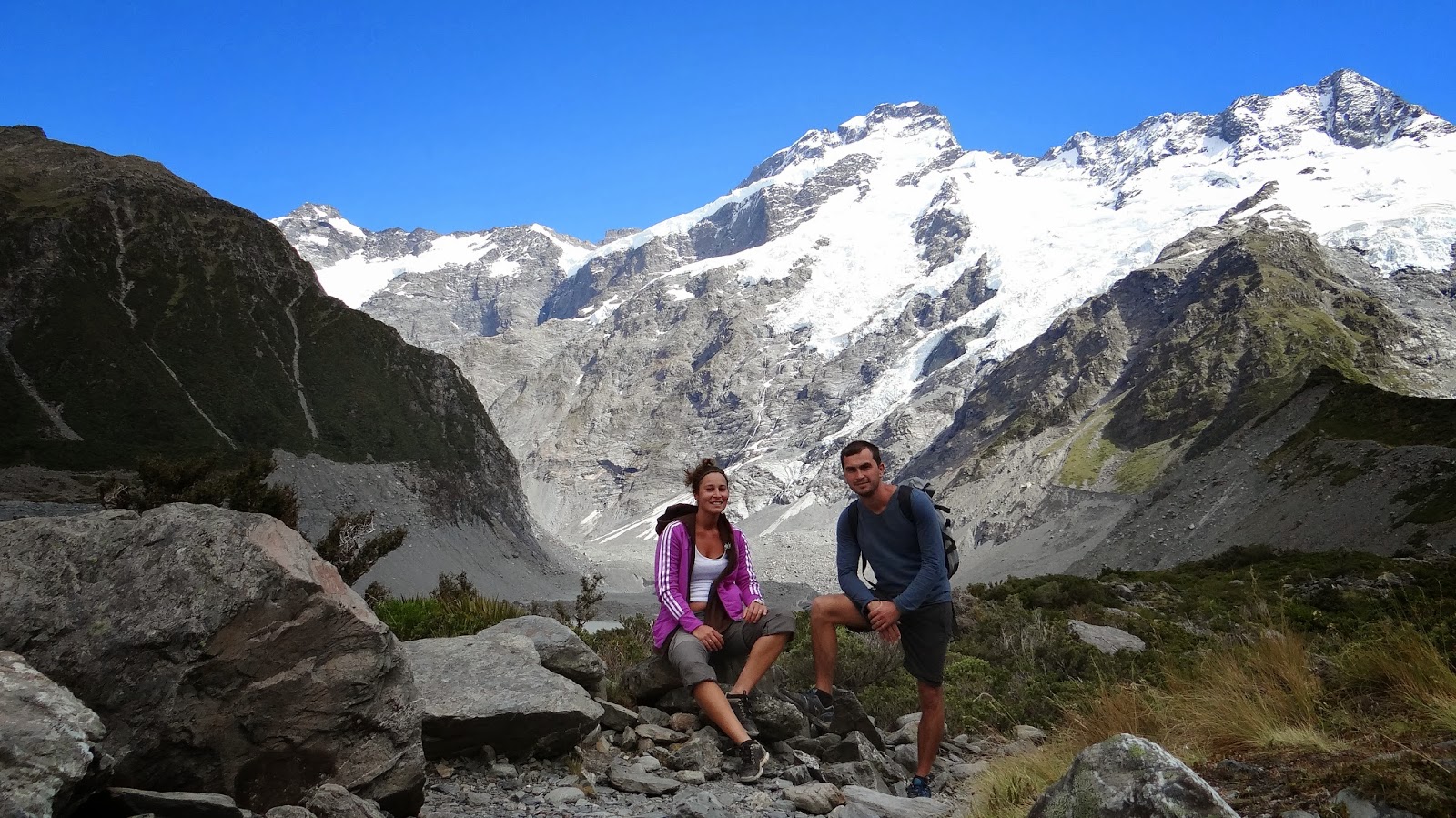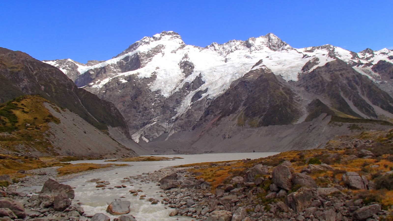 La fin de la marche donne sur le glacier Hook et le mont Cook,